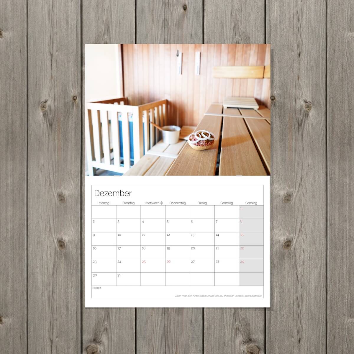 Wir haben eure Wünsche erhört! Der Mett-Terminplaner erlaubt euch nun auch Termine eintragen zu können, während ihr beim Anblick der Mettbrötchen dahin schmachtet. Der Kalender nimmt aufgeklappt eine Größe von DIN A3 ein. Das entspricht ca. 30 cm in der Breite und 42 cm in der Höhe.